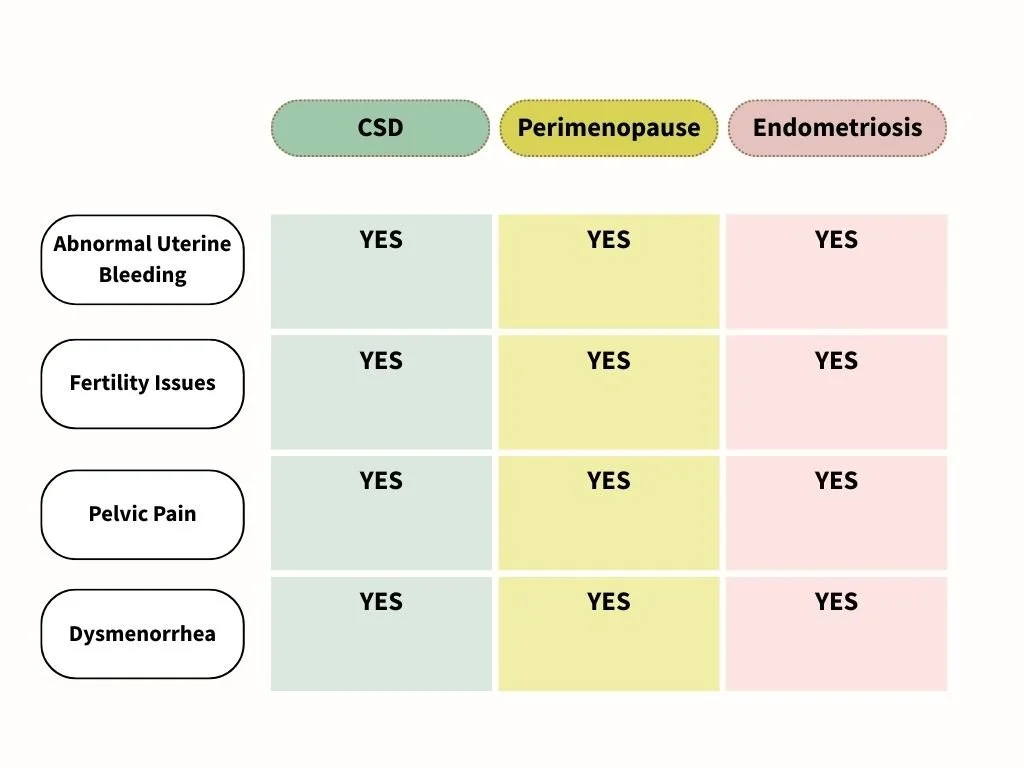 Many symptoms of CSD overlap with other conditions, particularly hormonal ones. The table below provides a brief snapshot; key references are at the end of the article.
